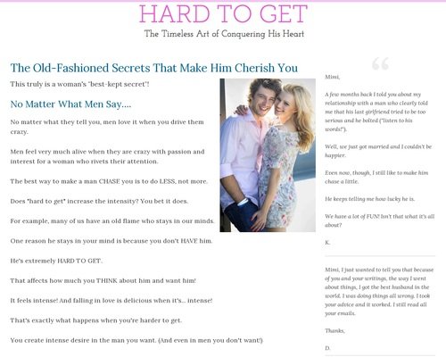 Hard To Get: The Timeless Art of Letting Him Chase You is backed with a 60 Day No Questions Asked Money Back Guarantee. If within the first 60 days of receipt you are not satisfied with Wake Up Lean™, you can request a refund by sending an email to the address given inside the product and we will immediately refund your entire purchase price, with no questions asked.