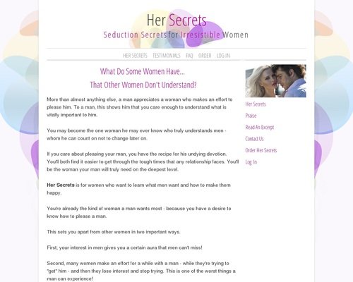 Her Secrets: Seduction Secrets For Irresistible Women is backed with a 60 Day No Questions Asked Money Back Guarantee. If within the first 60 days of receipt you are not satisfied with Wake Up Lean™, you can request a refund by sending an email to the address given inside the product and we will immediately refund your entire purchase price, with no questions asked.